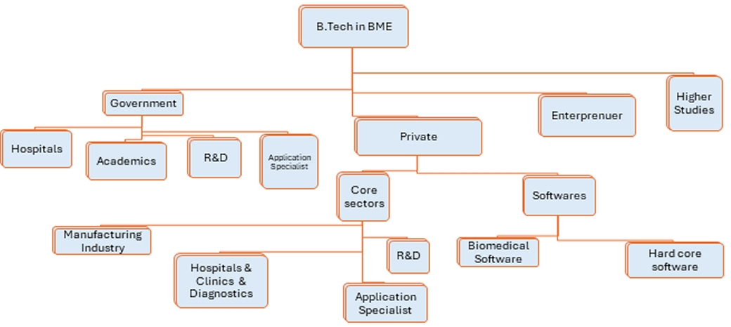 Biomedical Engineers can opt for numerous career opportunities and job prospects in multiple directions. The various career /placement options for a student who has pursued a degree in B.Tech in Biomedical Engineering are broadly illustrated by the following diagram.