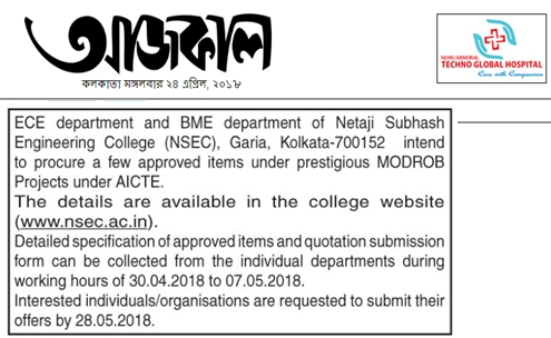 ECE department and BME department of Netaji Subhash Engineering College (NSEC), Garia, Kolkata - 700152 intends to procure a few approved items under prestigious MODROB Projects under AICTE.