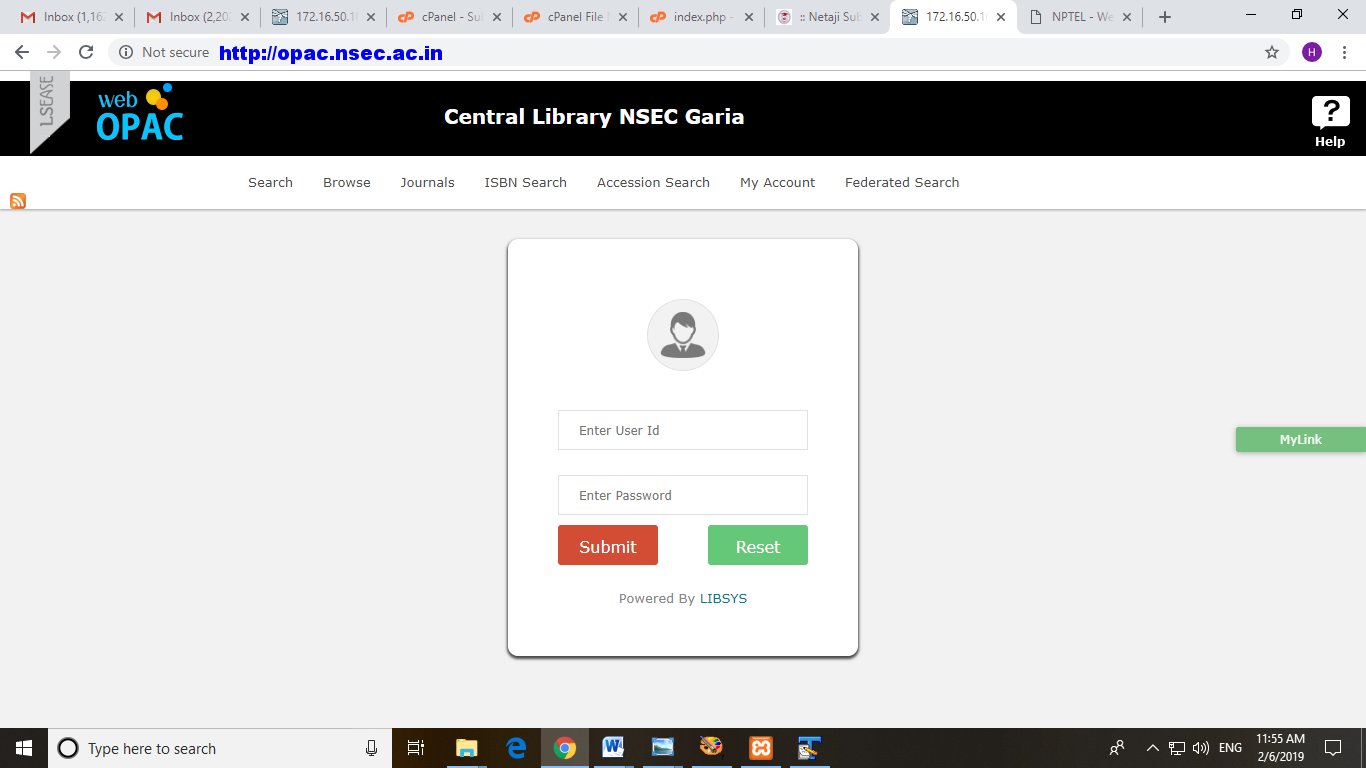 URL: http://opac.nsec.ac.in [Internet] URL: http://172.16.50.101:8380/opac [Intranet (LAN)] Collect your (students, faculty & all staff) password to access your personal area, please contact to Libraian |