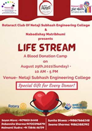 - Lifestream: We are pleased to present Life Stream - Blood Donation Camp as a part of the Covid relief Initiative held by Rotaract Club of NSEC along with Nabadishay Matribhumi. The Donors have been provided with the Certificates, Badges and appreciations. Our Principal of Netaji Subhash Engineering College and Rotary Club of Calcutta Dhakuria also sponsored the event. We were able to Collect 35 donations amid this situation making this event successful.