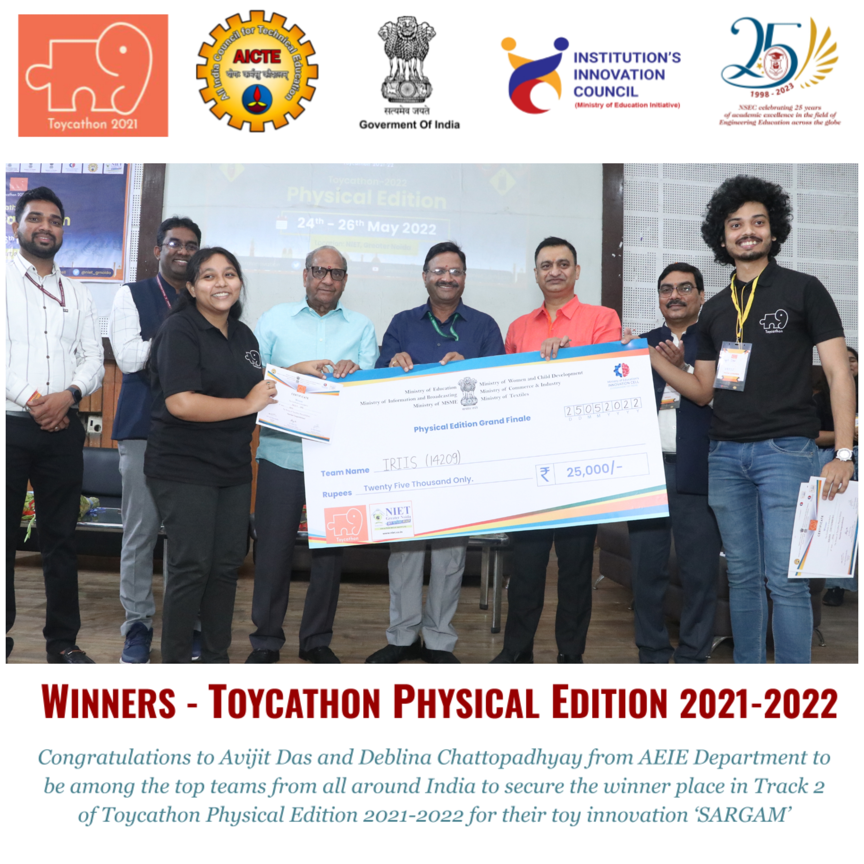 Avijit Das, an alumni of batch 2021 along with Deblina Chattopadhyay of 2023 batch from the Department of Applied Electronics and Instrumentation Engineering have secured the winner place in Track 2 of Physical Edition of Toycathon 2021-2022 under the theme ‘Divyaang’ with their Toy ‘SARGAM’. Sargam enables Divyaang (hearing impaired) people to feel the music. Apart from the prize money, and recognition the winners are eligible for receiving funding and mentoring from industry experts from the government of India for the productization of their innovation.
